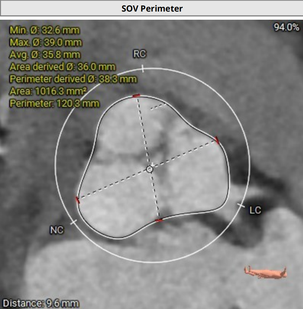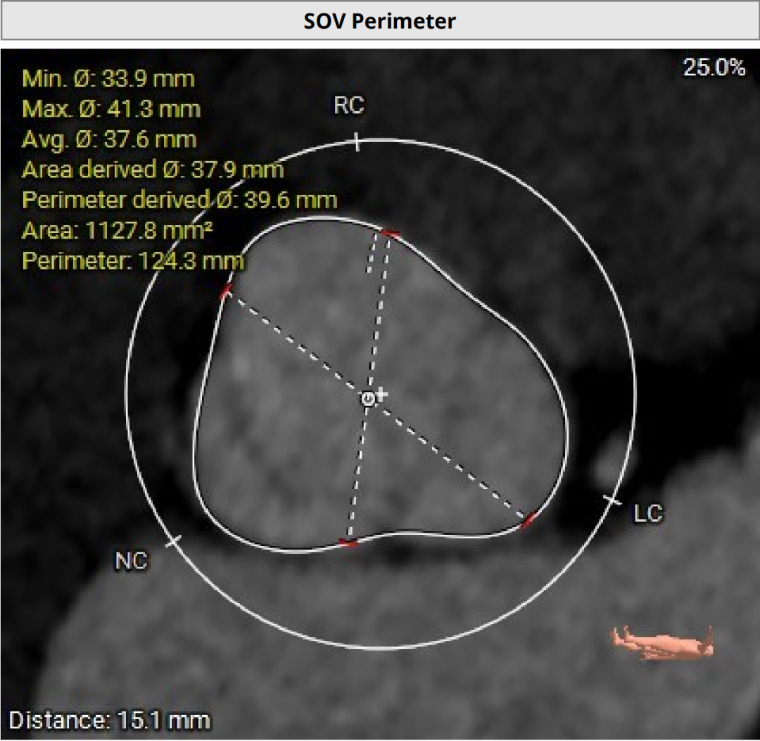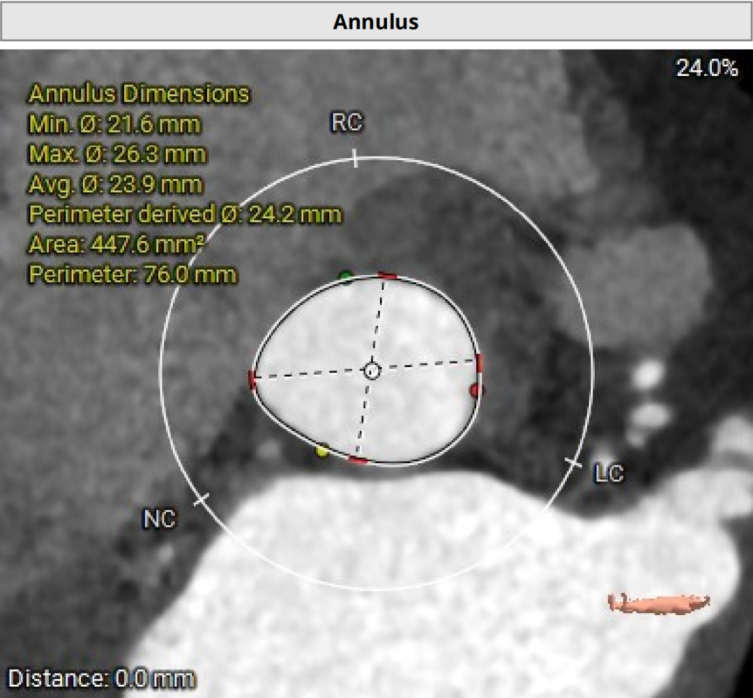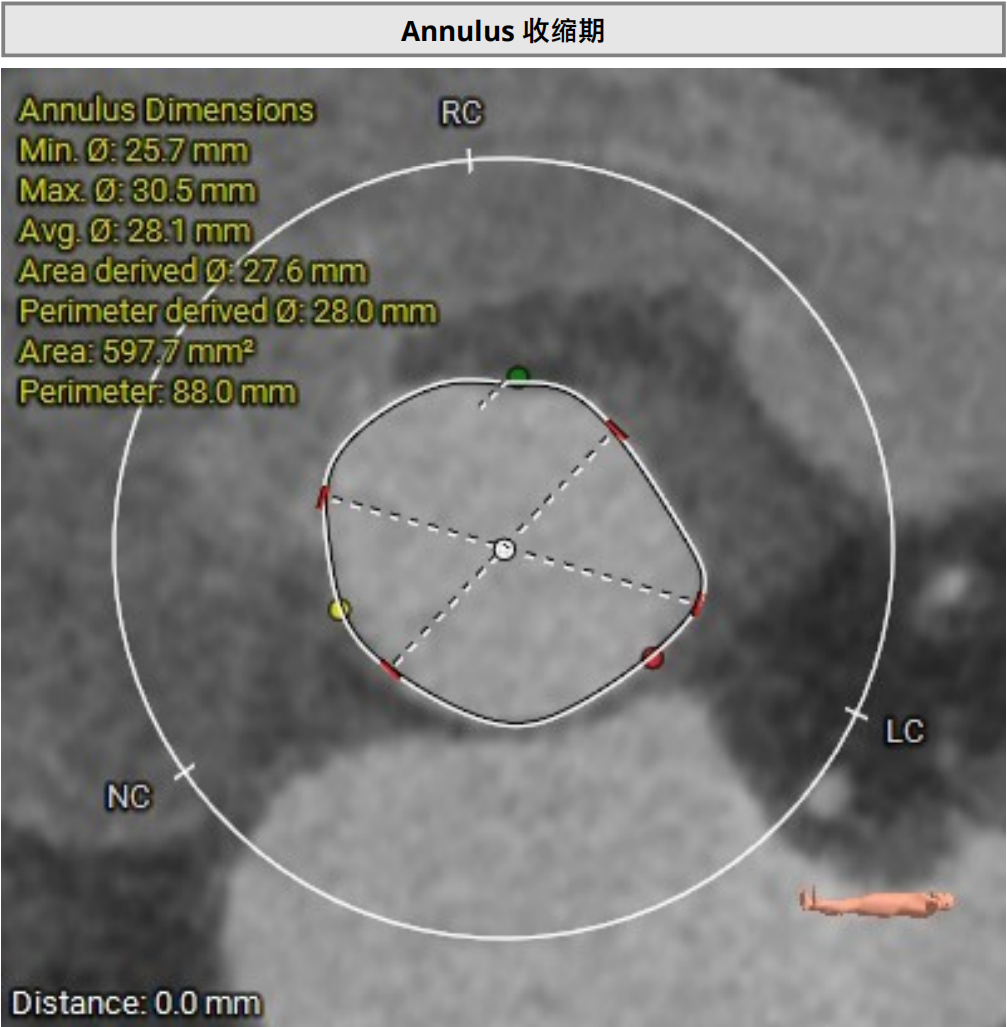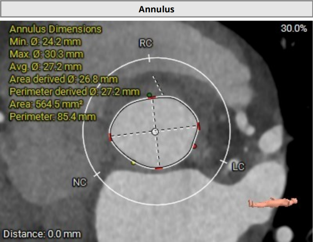 三叶式主动脉瓣,瓣环夹角63°,瓣环周长88mm,选用L号TaurusTrio瓣膜。