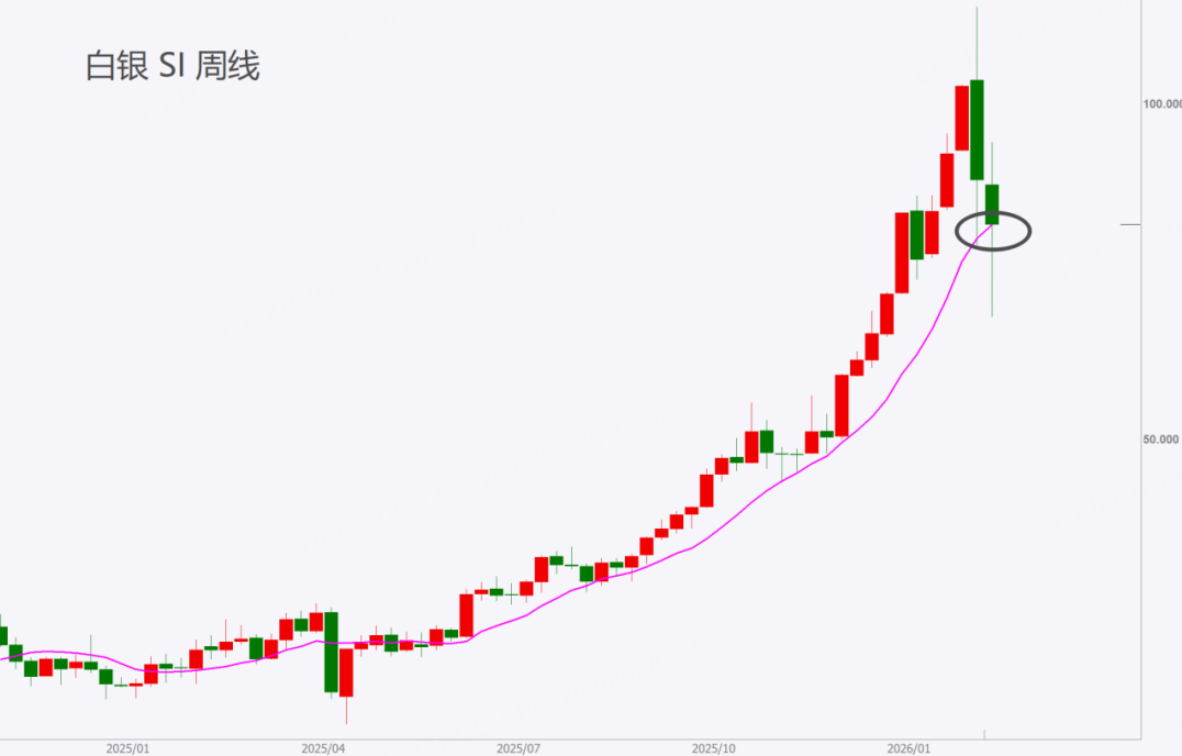 白银下跌,速度惊人。虽然近这10年都比较少见,但这是这类投机品种的正常波动。这里面市场情绪比基本面更容易影响投资者的决策,涨得有多快,下跌时速度也就有多块。白银从高点回撤至上周最低价时,跌幅已达47%,尽管数字比较大,但历史上白银杀跌,跌幅可达75%,因此目前就认定白银见底还是有点变数。技术上,白银跌幅虽大,但银价仍在10周均线上,所以关键看下周银价是否能稳定下来,不再下跌,那么均线仍然有效,继续以10周均线跟踪即可,短线投机的朋友也可以小量抄反弹,但估计反弹幅度大约为跌幅的50%(即白银价89附近),切记小量参与控制账面波动。