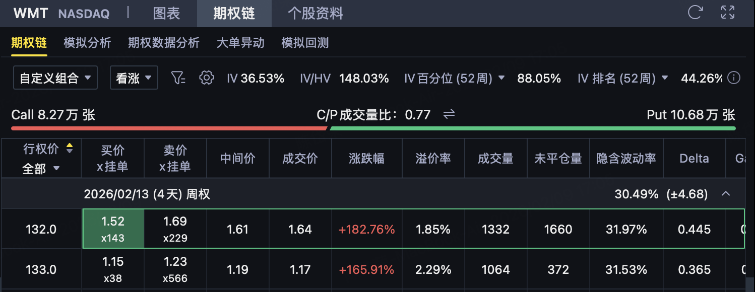 当沃尔玛到期价格 ≤ 132 美元时:
