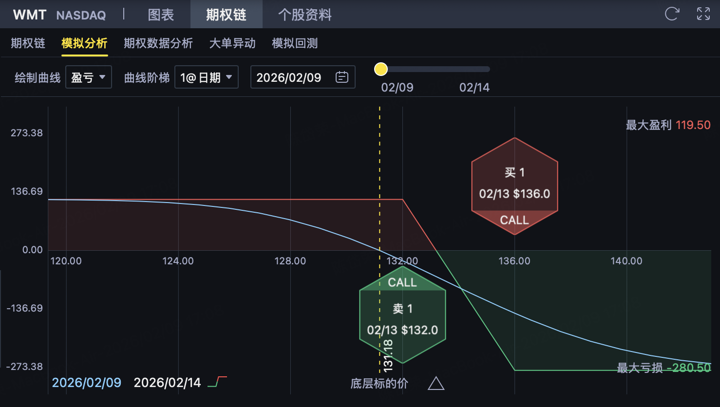该 Call 更接近当前价格,是策略权利金收入的主要来源。只要到期价格 ≤ 132 美元,该期权失效,投资者保留全部权利金。