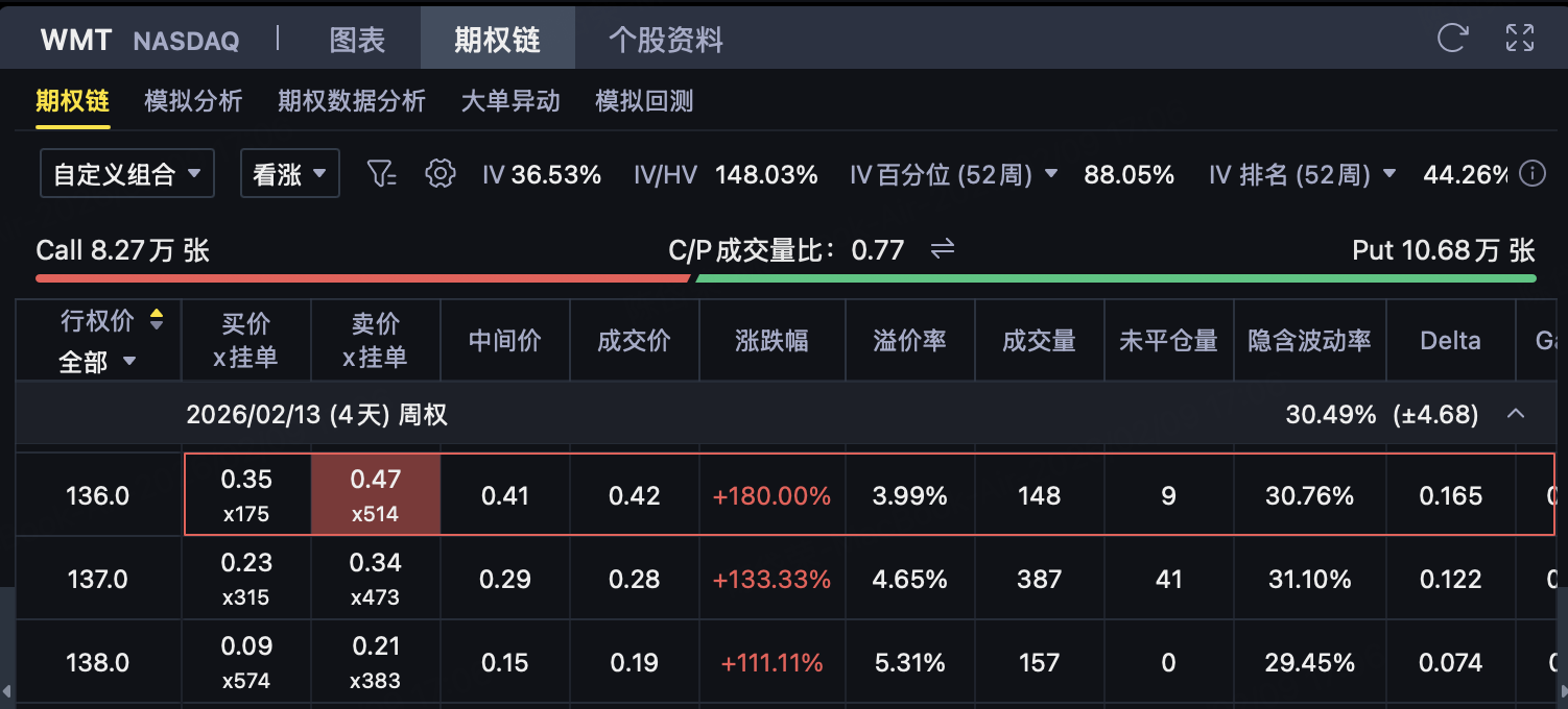 过去两周, $沃尔玛(WMT)$ 股价延续强劲上行走势,在消费防御板块整体稳健的背景下持续吸引资金流入。盘面结构显示,多数交易日收于阳线区间,价格不断刷新阶段高点,体现出市场对其基本面稳定性和盈利预期的认可。成交量虽未出现爆发式放大,但整体维持健康水平,说明上涨过程以持续买盘推动为主,而非短期情绪驱动。