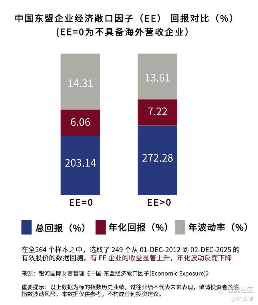 基于 264 家样本企业中 249 个有效样本 2012-2025 年的 13 年数据,银河国际财富管理聚焦 “经济暴露因子(EE)”进行研究:EE因子的核心是企业对中国 - 东盟(双方互称 “对岸区域”)的营收关联程度,其中 EE>5% 的 “高暴露组”,特指深度嵌入中国 - 东盟经济结构的企业;而 “超额收益”,是指这类企业相对无 EE 企业的额外收益,区间可达 130%-300%。