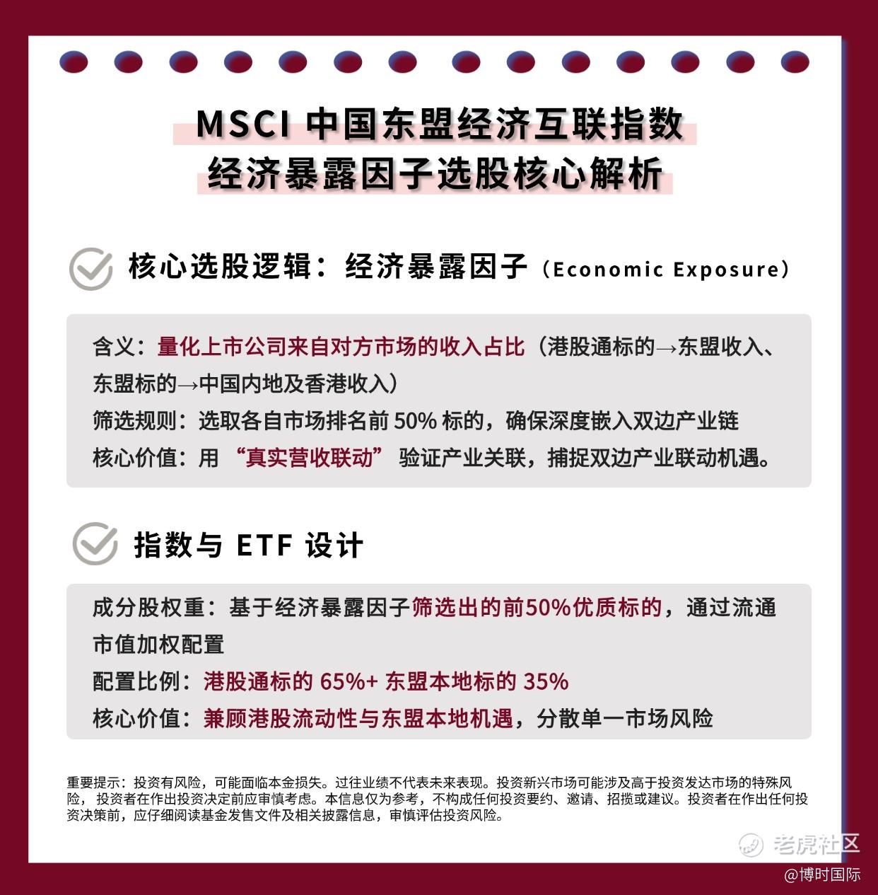 在全球产业链重构与区域经济融合的浪潮下,中国与东盟的经贸联动正成为亚太经济增长的重要引擎之一。银河博时 MSCI 中国东盟经济互联指数 ETF $银河博时东盟(02805)$ 作为聚焦这一主题的工具型产品,凭借独特的设计逻辑,以“经济暴露因子”为核心搭建选股体系,突破传统地域主题产品的局限,旨在为关注双边产业协作的投资者提供针对性的布局工具。