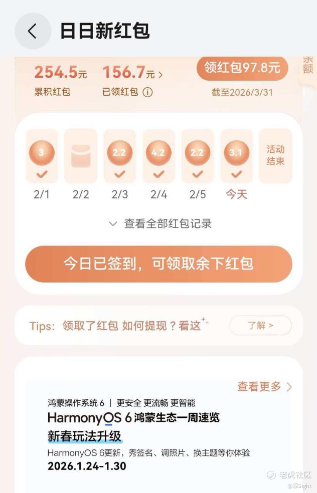 此外,**还上线了“鸿蒙生态日日新”签到红包,新机型、以及老机型升级鸿蒙系统后可参与,连续签到60天最高可领1000元现金。