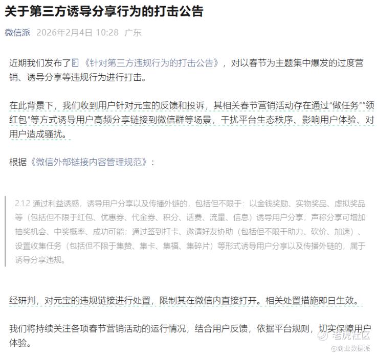 但微妙的一幕出现了——当元宝试图社交裂变时,却被微信亲手限流。2月4日,“微信派”发布公告,打击第三方诱导分享行为。