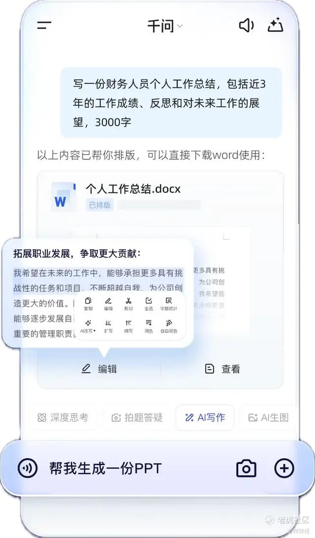 当你面对繁琐的工作报告无从下笔时,千问可以帮你快速梳理逻辑、生成初稿;