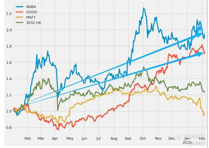 我们整理了一年以来阿里,谷歌,微软以及恒生科技指数跌走势情况,可以非常确切看到,阿里与谷歌股价走势非常接近,这一方面说明资本市场对两者“定性”非常接近(全栈式AI)。另一方面我们也注意到自2026年1月之后,阿里的走势更为独特: