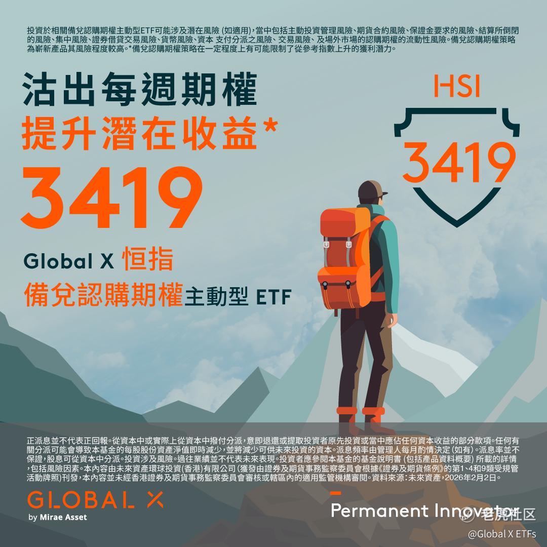 【仅供香港投资者参考】Global X 恒指备兑认购期权主动型 ETF(3419) $A GX恒指备兑(03419)$ 是香港市场首批上市的备兑认购期权 ETF 之一。它旨在通过结合恒生指数成分股投资与出售(沽出)相关认购期权的创新策略,为投资者提供潜在的收益1增强机会。