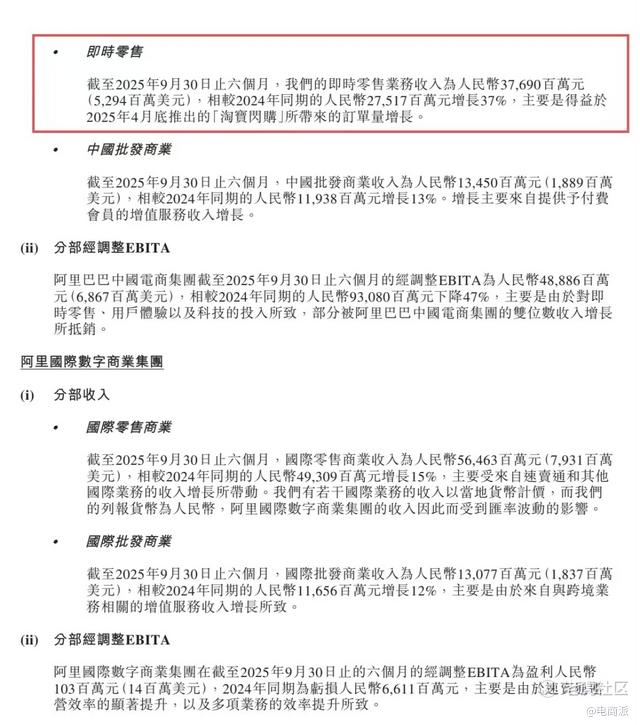 阿里巴巴2026财务年度中期报告显示,截至2025年9月30日止六个月,阿里巴巴的即时零售业务收入为人民币37,690百万元(5,294百万美元),相较2024年同期的人民币27,517百万元增长37%,主要是得益于2025年4月底推出的淘宝闪购所带来的订单量增长。