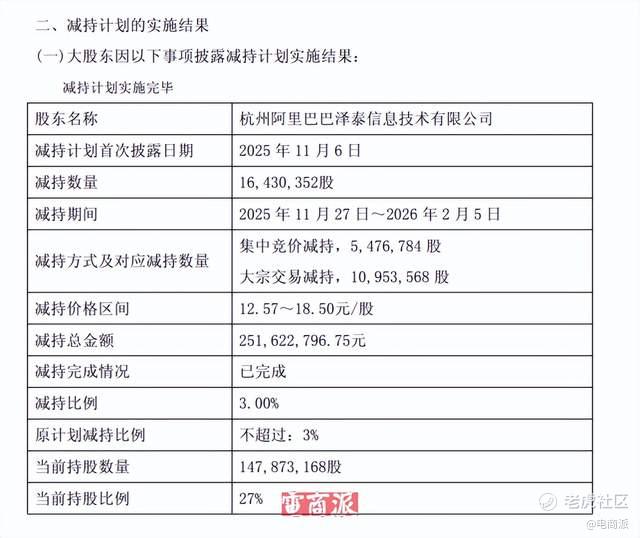 公告显示,阿里泽泰的此次减持计划早在2025年11月6日便已对外披露,拟通过集中竞价及大宗交易方式减持不超过1643.04万股(占公司总股本3%),减持期间为2025年11月27日至2026年2月5日。截至2026年2月5日,该减持计划已实施完毕。