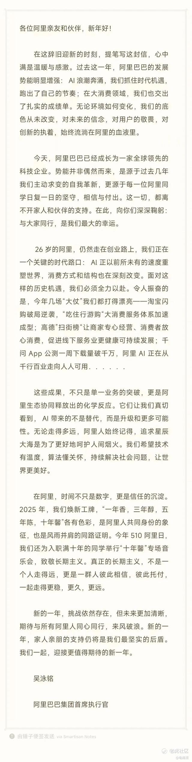 阿里CEO吴泳铭在新年家书中表示,2025年几场“大仗”打得很漂亮——淘宝闪购破局逆袭,“吃住行游购”大消费服务体系加速成型;“高德扫街榜”让商家专心经营、消费者放心消费,促进线下服务业更健康可持续发展;千问APP公测一周下载量破千万,阿里AI正在从千行百业走向人人可用......