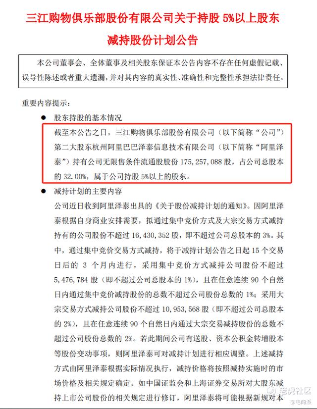 2月5日,三江购物发布公告披露,公司持股5%以上股东杭州阿里巴巴泽泰信息技术有限公司(下称 “阿里泽泰”)已完成此前披露的减持计划,本次累计减持公司股份1643.04万股,占公司总股本的3%,减持套现总金额约2.52 亿元。本次减持完成后,阿里泽泰对三江购物的持股比例由原本的30%降至27%。