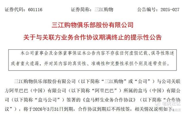 值得一提的是,三江购物与盒马的合作已进入倒计时:2025年8月初,三江购物发布公告称,公司与盒马的合作协议将于2026年3月31日到期,且到期后不再续签。