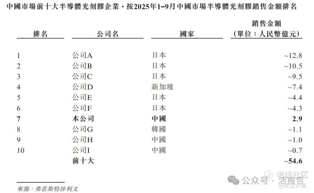 在中国市场,公司于2025年1-9月的半导体光刻胶销售额排名第七,并且为中国市场半导体光刻胶销售金额第一的本土公司。