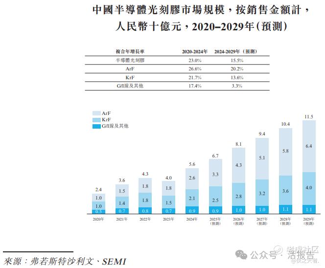 根据弗若斯特沙利文(Frost & Sullivan)的报告,中国半导体光刻胶市场的销售金额从2020年的人民币24亿元增长至2024年的人民币56亿元,复合年增长率为23.0%,预计2029年将达到人民币115亿元,期间复合年增长率为15.5%。