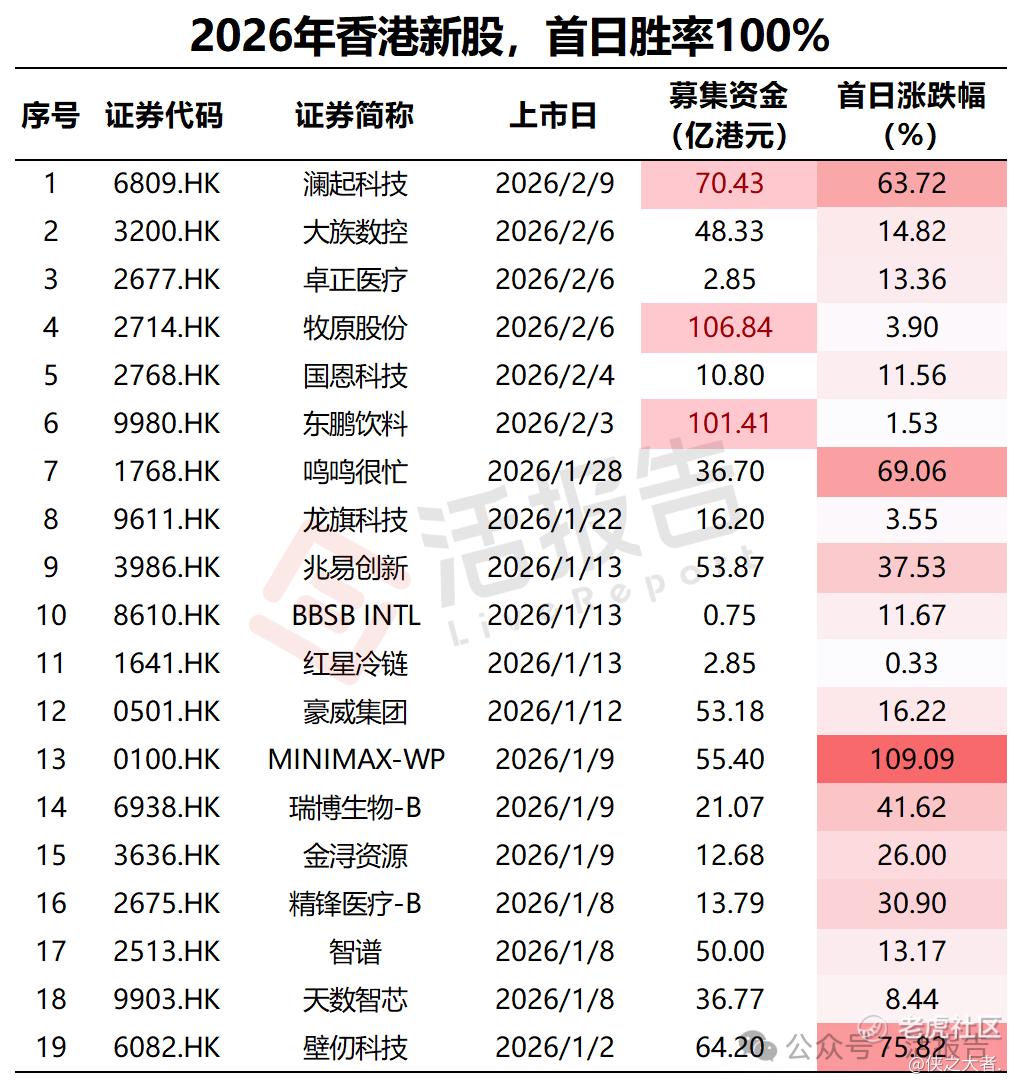 据**大数据,截至2月9日,今年以来的香港新股在上市首日全部上涨,首日胜率达100%。