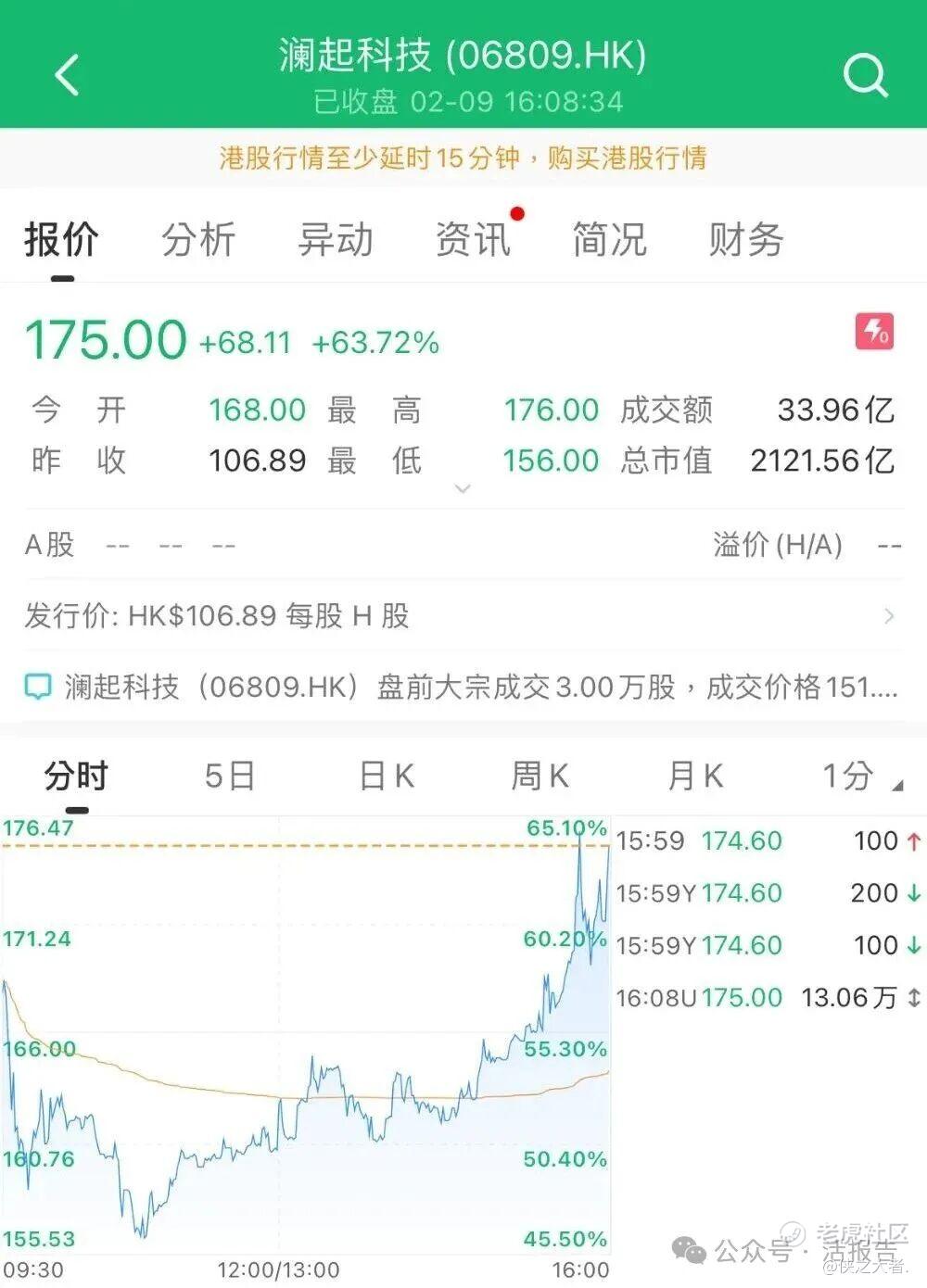公司上市首日表现极为强劲,开盘报168港元,较106.89港元的发行价大幅高开57.17%,盘中最高触及176港元,涨幅一度接近65%。截至收盘报175港元,较发行价大涨63.72%。按收盘价计,一手可赚6811港元(不计佣金手续费)。截至首日收盘,总市值约2,122亿港元,H股市值约115亿港元,全天成交额约33.96亿港元。