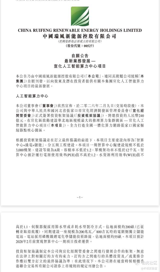 2026年2月9日,港股上市公司瑞风新能源(00527. HK)抛出一则公告:公司拟与河北省张家口市宣化经济开发区管理委员会合作,投资约240亿元建设人工智能算力中心项目。