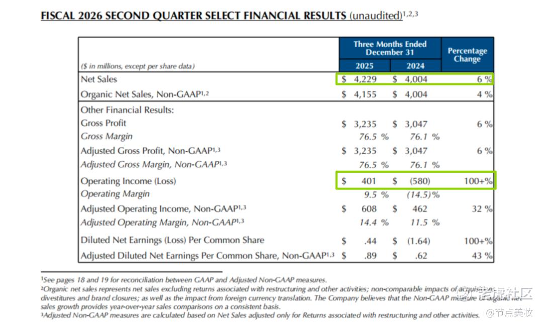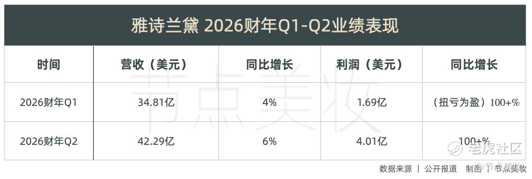 近日,雅诗兰黛集团发布了2026财年第二季度财报,净销售额同比增长6%至42.29亿美元,净利润实现关键性扭亏为盈,从去年同期的巨亏5.9亿美元,转为盈利4.01亿美元,同比增幅超过100%。