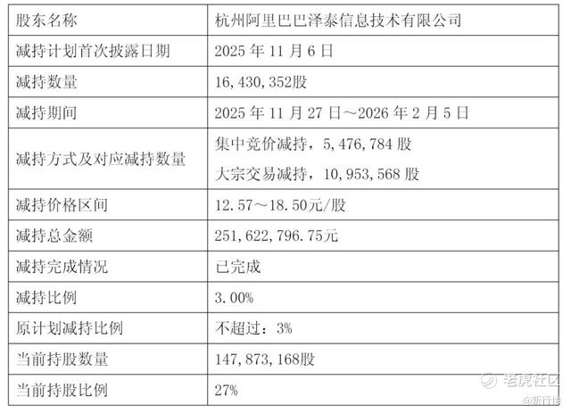 2025 年11月,阿里泽泰再次披露减持计划,拟减持3%的股份。2026年2月,也就是近日,该计划提前完成,通过集中竞价减持 547.68 万股、大宗交易减持 1095.36 万股,合计减持 3%,套现约2.52 亿元。