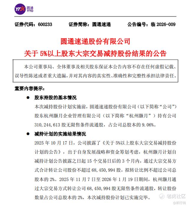 1月19日,圆通速递发布公告,公司持股5%以上股东杭州灏月企业管理有限公司通过大宗交易方式累计累计套现约10.89亿元。