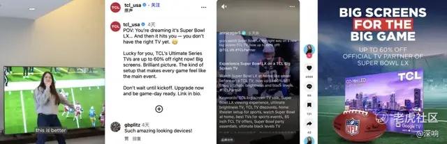 比如TCL就不断亮明NFL“官方电视合作伙伴”(Official TV Partner)的身份,推广核心产品、发起促销活动。TikTok、Instagram、Facebook等社交媒体上,种草内容眼花缭乱。其实TCL一直在体育营销上就肯下血本,今年冬奥会,TCL也是深度参与,打造了一个属于自己的“传奇二月”。