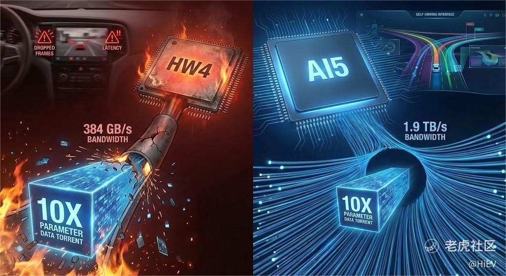 模型再大 10 倍呢?每秒 3.75TB。HW4 的带宽无法支撑这样的规模。AI5 的 1.9 TB/s 带宽,就是为这个准备的。