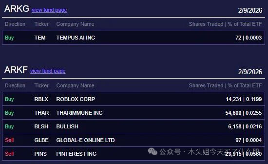 木头姐今天买入2200万美元RBLX、180万美元BLSH、2.5万美元TEM、23万美元THAR、2万美元KDK。