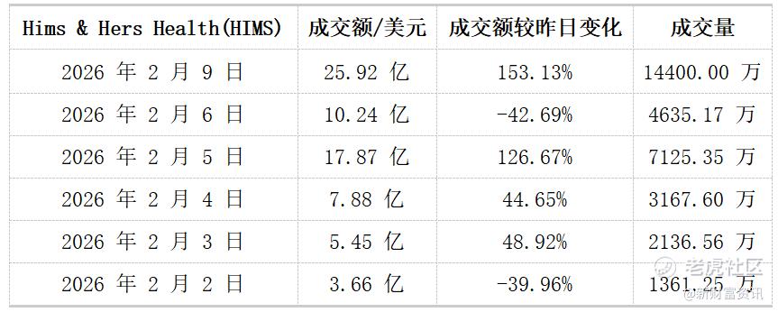 先给大家摆组实打实的数据,感受下HIMS近期的股价波动有多魔幻。Hims & Hers Health(HIMS)于2026年2月9日收盘报19.33美元,该股整个2月跌15%左右,年初至今跌近29%,过去52周跌45.90%,相当于直接腰斩。
