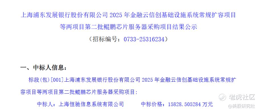 近日,上海浦东发展银行正式公布《2025 年金融云信创基础设施系统常规扩容项目等两项目第二批鲲鹏芯片服务器采购项目》中标结果,项目中标金额达 1.58 亿元,由神州鲲泰金牌代理商上海恒驰信息系统有限公司中标。本项目中标的核心产品为神州数码旗下AI基础设施品牌神州鲲泰的系列服务器,作为项目核心供应方,神州鲲泰将全程提供高性能鲲鹏芯片服务器设备,为浦发银行金融云信创基础设施扩容筑牢核心算力底座,全力助力其数字化转型与信创战略深度落地。 $神州数码(000034)$