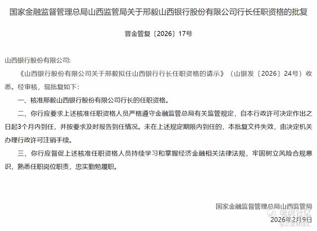 2月10日,国家金融监督管理总局山西监管局发布批复,核准邢毅山西银行股份有限公司(下称“山西银行”)行长的任职资格,这家省属核心城商行的行长职位空缺正式补齐。