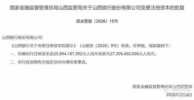 同日,监管部门同步批复同意山西银行变更注册资本,由258.94亿元增至273.09亿元,为其后续发展注入新动能。