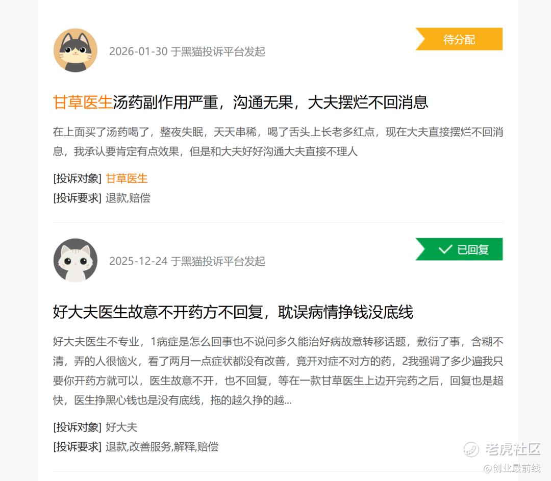 黑猫投诉上,有用户表示,在平台购买汤药后,出现失眠、腹泻、舌体红点等,与接诊医师沟通时,对方拒绝回应。