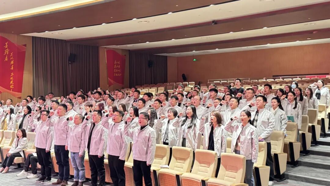 “我志愿加入中国共产党……”在宫书记的带领下,全体党员起立,高举右拳,重温入党誓词。铿锵有力的誓言在会场回荡,唤起了每位党员最初的理想信念和入党初心。