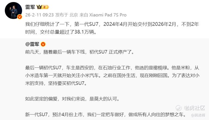 小米SU7上市近2年,交付38.1万台,对于造车不久的小米来说,这无疑是一个了不起的成绩。雷军在微博上透露,最后一辆初代SU7车主是西安的,在石油行业工作,选的是橄榄绿。“他是米粉,从小米造车第一天就开始关注小米汽车。之前在国外生活,现在刚刚回国。为了表达对小米的支持,坚持要买初代SU7。”