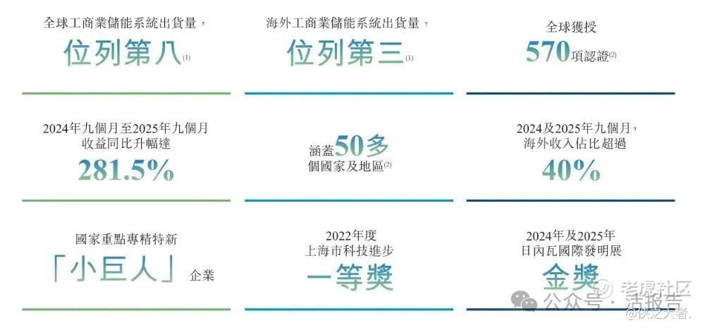 根据弗若斯特沙利文的资料,截至2025年9月30日止九个月,公司在中国工商业900家锂离子电池储能系统集成商中,全球工商业储能系统出货量位列第八及在海外市场工商业储能系统出货量位列第三。公司始终秉持全球化战略,是中国首批进军海外工商业储能市场的企业之一。