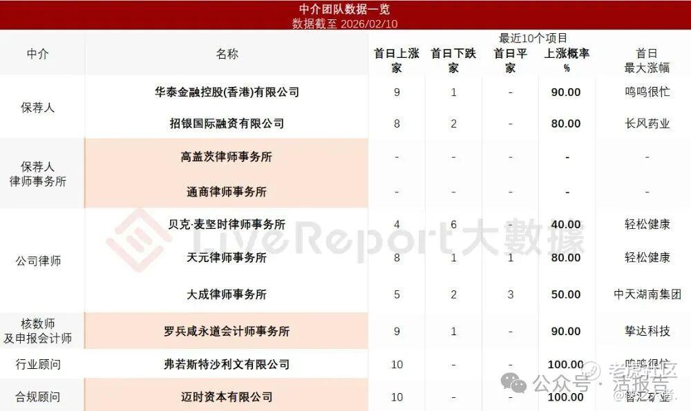 据**大数据统计,为恒智能中介团队共计10家,其中保荐人2家,近10家保荐项目数据表现可靠;公司律师共计3家,综合项目数据表现有待提升。整体而言中介团队历史数据表现良好。