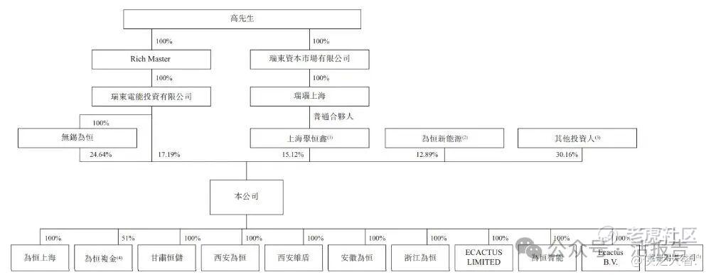 高先生通过无锡为恒、瑞东电能投资、上海聚恒鑫(雇员激励平台)分别持股24.64%、17.19%、15.12%,合计控制56.95%的投票权,为恒新能源(雇员激励平台)持股12.89%。