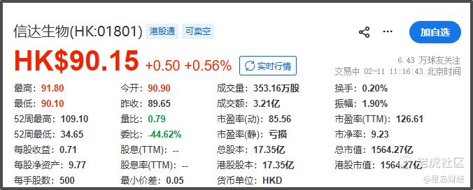 受上述两个利好消息的刺激,信达生物股价连续上涨,2月9日大涨7.42%,2月10日、11日继续高开高走,截至11日11时左右,信达生物港股报90.15港元/股,上涨0.56%,总市值1564.27亿港元;较2月6日收盘的总市值,增加逾180亿港元。
