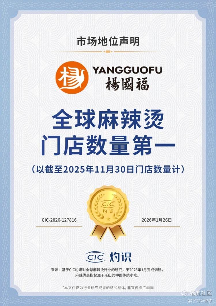近日,杨国福取得由国际权威咨询机构CIC灼识确认的“全球麻辣烫门店数量第一(以截至2025年11月30日门店数量计)”市场地位声明!