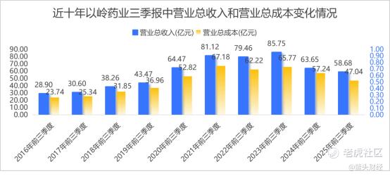 2025年前三季度,以岭药业营业收入为58.68亿元,仍然同比下降7.82%,继续延续着下滑态势。