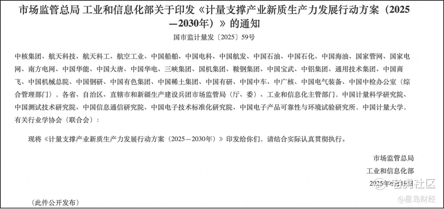 2025年7月9日,市场监管总局、工业和信息化部印发了《计量支撑产业新质生产力发展行动方案(2025—2030 年)》,明确了仪器仪表等10个重点产业领域。