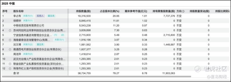 信而泰2025年中报数据显示,法定代表人兼董事长李占有为实际控制人,持股比例占20.85%。除此之外,北京信利和咨询管理中心(有限合伙)的法定代表人徐明华持股11.81%,中移投资持股11.20%。