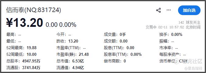 截至2026年2月11日中午收盘,信而泰(831724.NQ)报13.2元,成交额与换手率均为0,静态市盈率21.48,总市值约6.53亿元。
