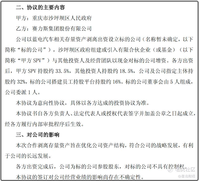 公告显示,赛力斯将以蓝电汽车相关存量资产剥离出资设立标的公司(名称暂未确定,下称“标的公司”),沙坪坝区政府组建或引入有限合伙企业(或基金)(下称“甲方SPV”)与其他投资人及经营团队以现金对标的公司增资。各方出资后,甲方SPV持股约33.5%,其他投资人持股约18.5%,公司及公司指定主体持股约32%,标的公司搭建员工持股平台持股约16%。标的公司董事会由5人组成,公司委派1人。