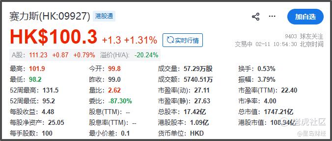 截至2月11日11时左右,赛力斯港股报100.3港元/股,当日上涨1.31%,总市值1747.21亿港元。