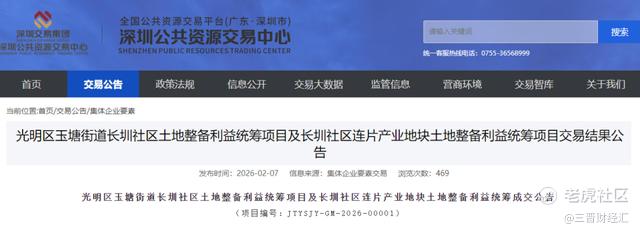 2月7日,深圳公共资源交易中心发布公示,披露深圳市光明区玉塘街道长圳社区两项土地整备利益统筹项目的中标结果。