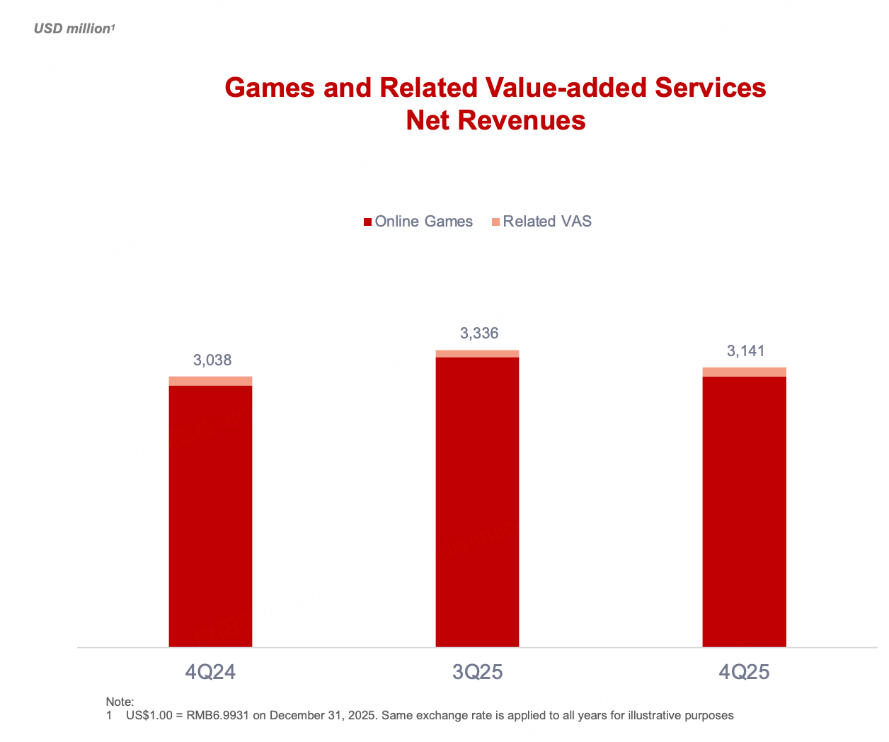 2025 年第四季度游戏及相关增值服务净收入为人民币 220 亿元,上一季度和去年同期分别为人民币 233 亿元和 212 亿元;本季度,来自于在线游戏的净收入约占该分部净收入的 96.8%,上一季度和去年同期该占比分别为 97.6% 和 96.7%;在线游戏净收入环比减少主要由于上一季度暑期活动较多,其同比增加来自《梦幻西游》电脑版,以及新上线的《燕云十六声》和《漫威争锋》等自研游戏净收入提升。