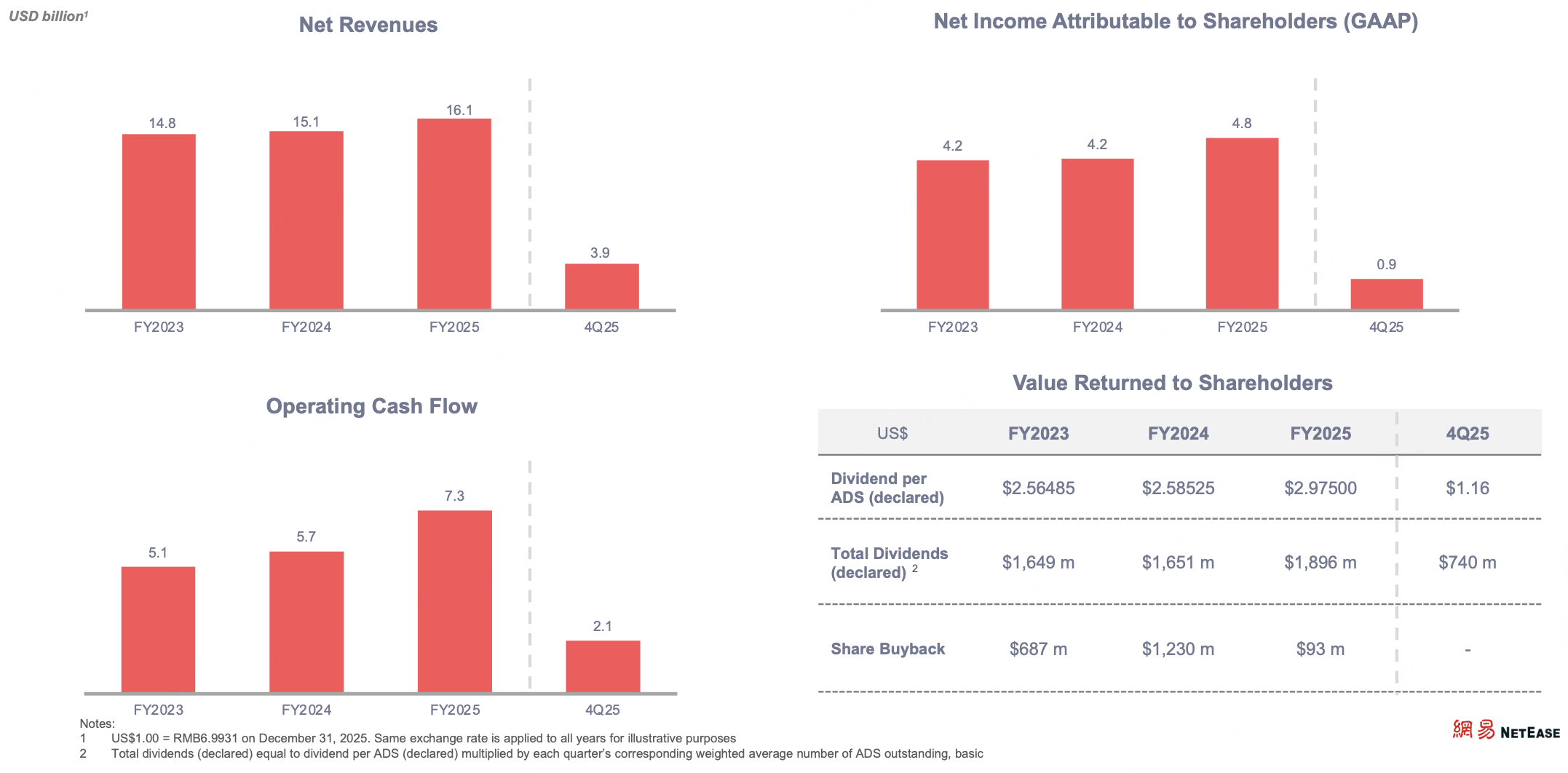 更重要的是,公司的现金流状况依然良好。2025 全年净收入 1,126 亿元,高于 2024 年 的1,053 亿元,其中游戏及相关增值服务收入 921 亿元,高于 2024 年 的836 亿元。全年经营活动现金流 507 亿元,年末净现金 1,635 亿元。股东回报依然稳健:董事会批准 Q4 股息 每 ADS 1.16 美元,同时回购计划额度维持最高 50 亿美元并延长至 2029 年。对于一家以内容产品周期为核心的公司而言,这种“稳定现金流 + 持续回报”的组合,本身就是公司估值稳定的重要来源。