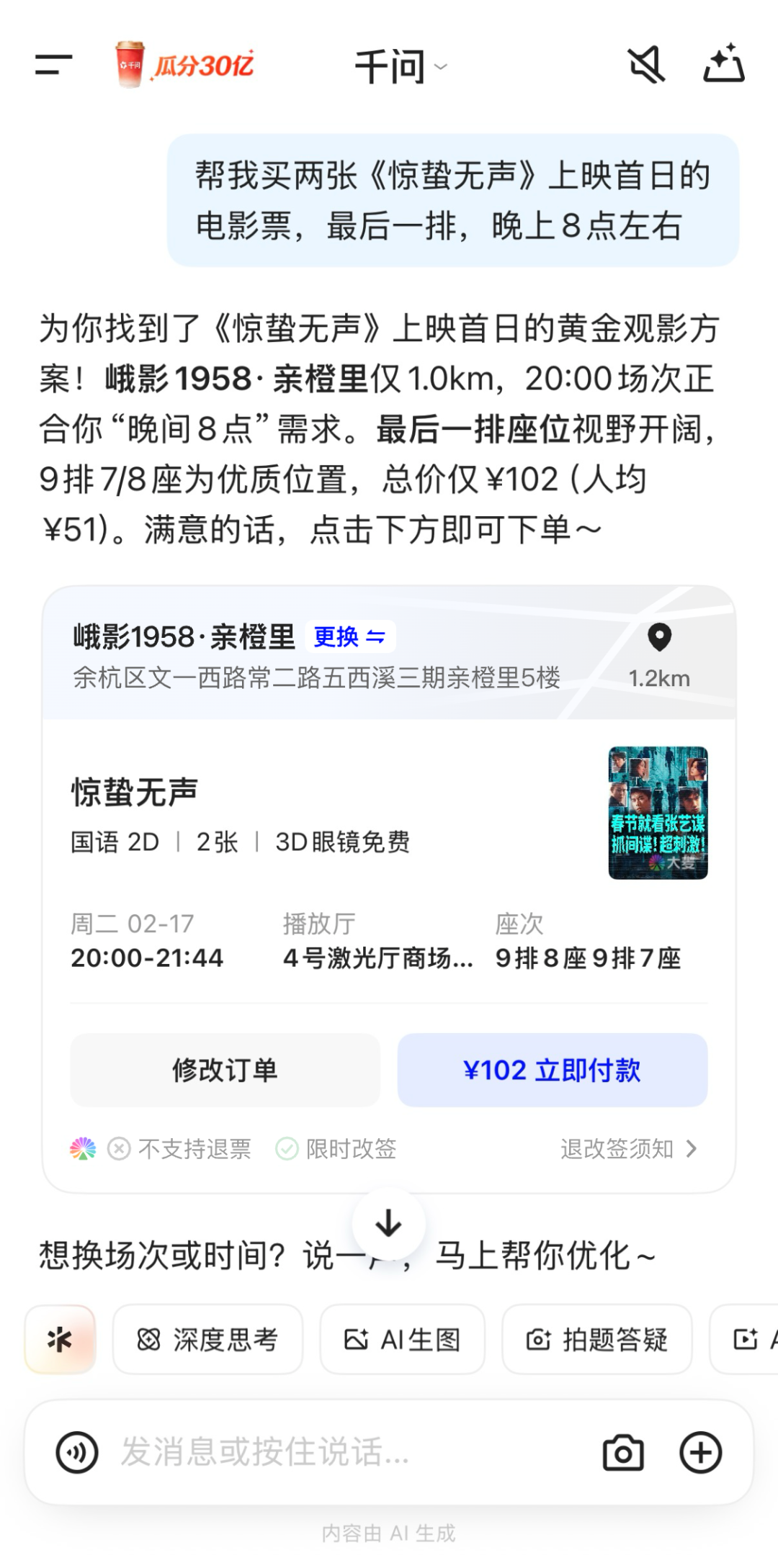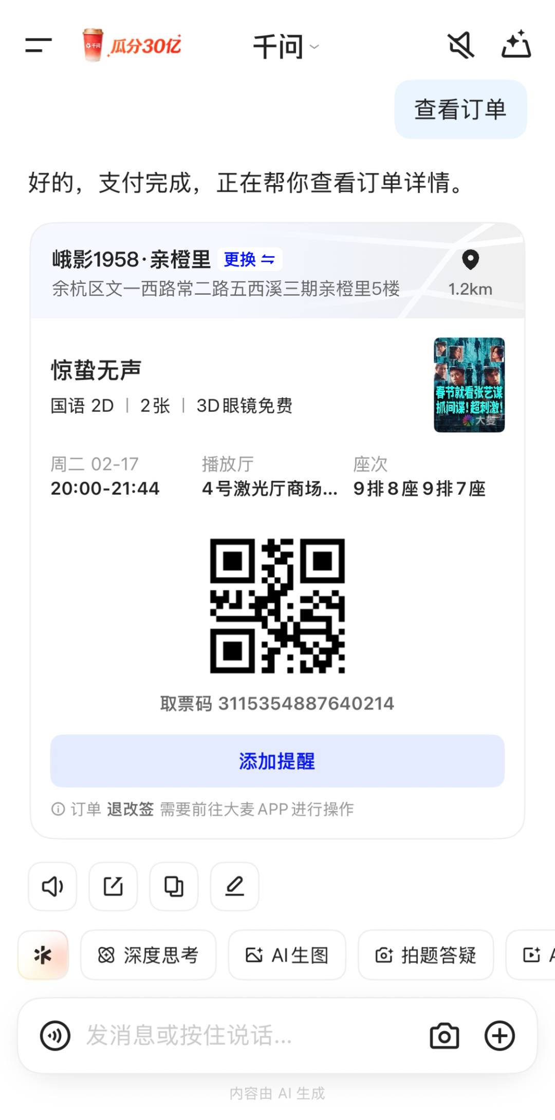 千问APP接入大麦测试“一句话买电影票”